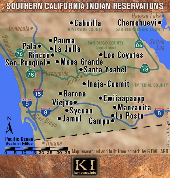 I researched and built the above casino locator map from scratch in Photoshop, including the below Reservations and Lands of The Kumeyaay maps.