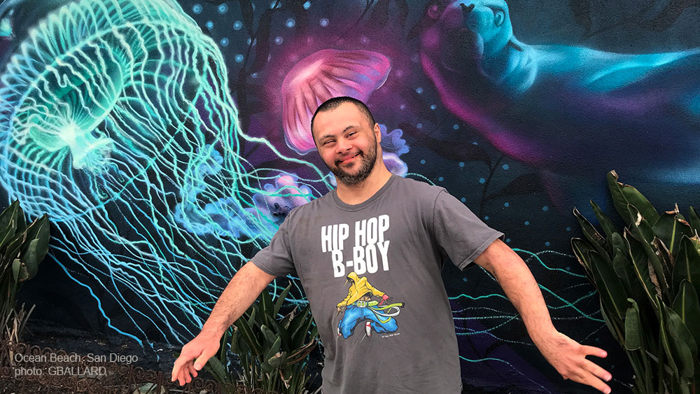 Hip Hop posing for a photo in front of an art mural in Ocean Beach, San Diego, California. He is right across the street of Ocean Beach Pier. Glowing neon jelly fish, curious seal, and sea weeds are pictured in the art. I shot it on my iPhone Pro Max camera.